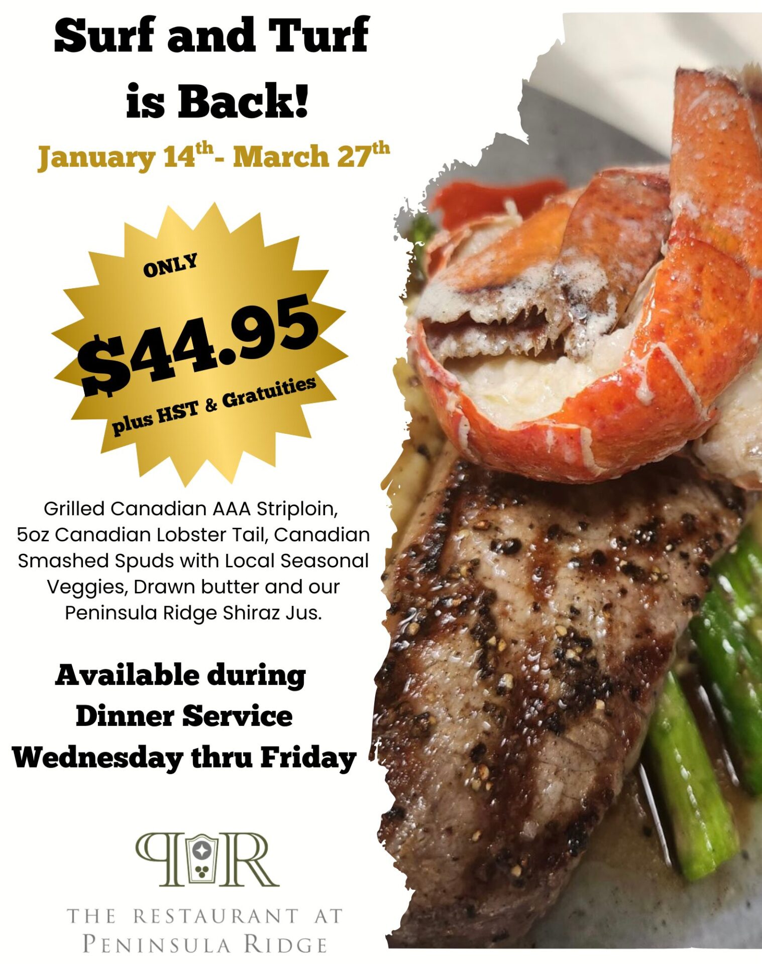 SURF and TURF is BACK!!~ The Restaurant at Peninsula Ridge by susan | Jan 8, 2026 | Seasonal, Wine & Food Pairings The Restaurant at Peninsula Ridge Re-Opening for the Season January 14th 2026 For a remarkable night out that won’t break the bank, visit us for our most popular feature of the year. To make a reservation online- click here- By phone 905 563-0900 x35